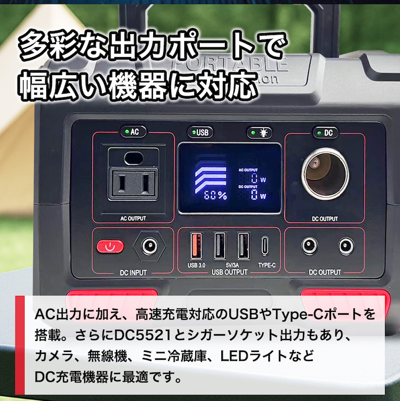AC出力に加え、高速充電対応のUSBやType-Cポートを搭載。さらにDC5521とシガーソケット出力もあり、カメラ、無線機、ミニ冷蔵庫、LEDライトなどDC充電機器に最適です。